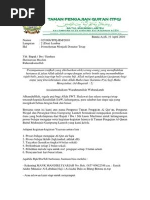 Surat proposal pengajuan dana harus dibuat dengan seksama dan dibuat secara profesional dengan tujuan untuk meyakinkan calon donatur atau . Dengan begitu, calon donatur berpeluang besar memberikan sumbangan untuk kegiatan yang kamu buat. Pendahuluan segala puji syukur kita panjatkan kehadirat allah swt, tuhan semesta alam atas rahmat, berkat dan . Permohonan dana kegiatan ramadhan 1432 h kepada yth. Proposal pengajuan dana penting untuk menentukan keputusan calon donatur. 1 bundle proposal jakarta, 13 juni 2016 kepada yth, bapak / ibu donatur . Penyebutan nama donatur oleh mc pada setiap kegiatan. Sahabat 99, pengajuan bantuan dana bisa gagal . Mengger girang kelurahan pasirluyu kecamatan regol kota bandung. 1 |proposal ifthor tpq nur huda. Berikut contoh proposal pengajuan bantuan dana lengkap tipsnya. Contoh proposal kegiatan ramadhan irkal 1436 h. Dana yang kita gunakan untuk pelaksanaan kegiatan ini adalah dana yang di peroleh dari lembaga dan donatur serta infaq dari kader.