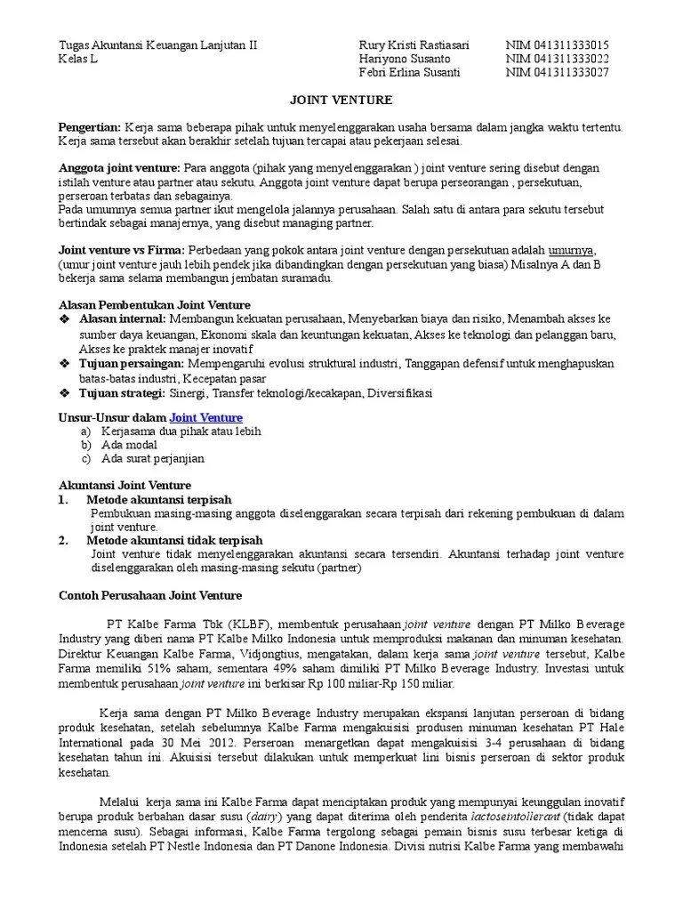 Apabila sengketa tersebut terjadi antara direksi, atau antara pemegang saham dengan direksi perusahaan joint venture (kasus gugatan derivatif), . 13 widayat utoyo, akuntansi keuangan lanjutan: Sharing perusahaan joint venture dengan analisis perspektif syariah. Soal latihan akuntansi keuangan lanjutan i bahan uas . Dalam pengertian yang luas, perjanjian patungan (joint venture) adalah bentuk persekutuan yang menekankan kerjasama lebih daripada untuk suatu yang.