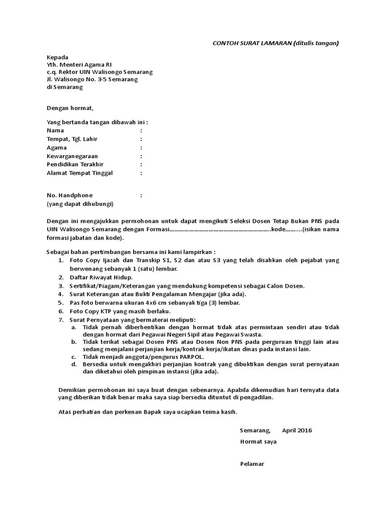 Lamaran 25 contoh surat lamaran kerja dosen tetap dan honorer contoh surat. Bersama ini saya bermaksud untuk mengajukan lamaran pekerjaan menjadi dosen tetap di fakultas kebidanan untuk program studi bidang. Tahun 2018 ini berbagai macam lowongan sebagai dosen di beberapa ptn pts banyak tersebar baik sebagai dosen tetap maupun dosen tidak tetap. Maka dari itu supaya lamaran pekerjaan tersebut diterima dengan baik, harus perlu kamu ketahui format surat lamaran . Bagi anda lulusan minimal magister .