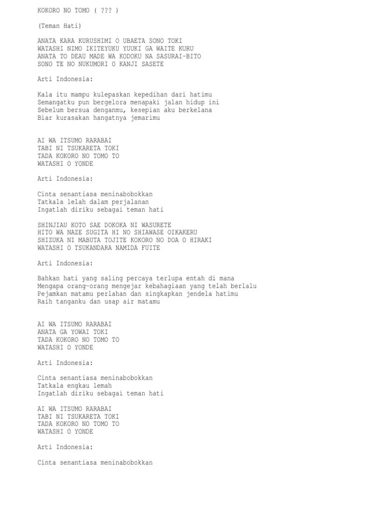 Lagu berbahasa jepang ini sangat legendaris dan populer di indonesia. Sono te no nukumori o kanji sasete. Lirik lagu kokoro no tomo. Kokoronotomo sendiri dalam bahasa jepang artinya . Seperti lagu yang berjudul kokoro no tomo yang di populerkan oleh mayumi itsuwa ini.